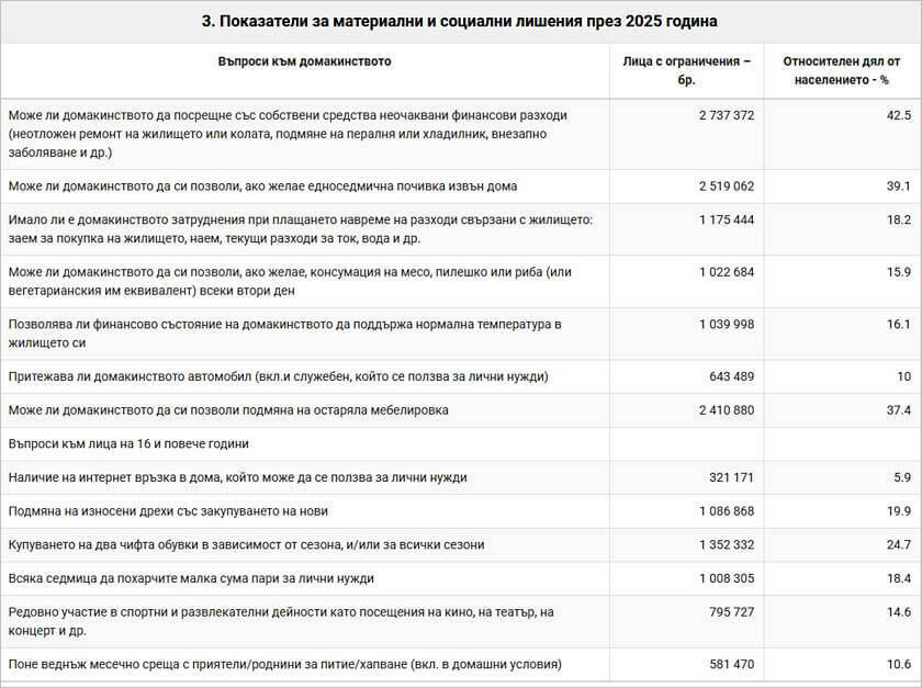 През 2025 г. 15.0% от населението живее в тежки материални и социални лишения (ограничения в 7 от 13 показателя), или с 1.6 процентни пункта по-малко в сравнение с 2024 година: